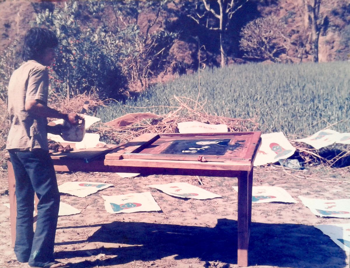 BL: Well, that is somebody screenprinting in the open air with the simplest equipment you could imagine. We were working in a village in Nepal with UNICEF, and we did experiment with trying to make the blue filler locally appropriate. So they suggested that we boiled up some shin bones of water buffalo, in order to make some glue. We did a lot of work in all different parts of India and in Nepal, and loads of other countries. It was a very educational time for me, we were trying to develop images that people could understand. And a lot of the people who would be seeing those image had never seen any picture in their lives before. It made me go back to thinking how pictures are constructed. There's 101 pictorial conventions that we all in this society learn without realising we're learning it.