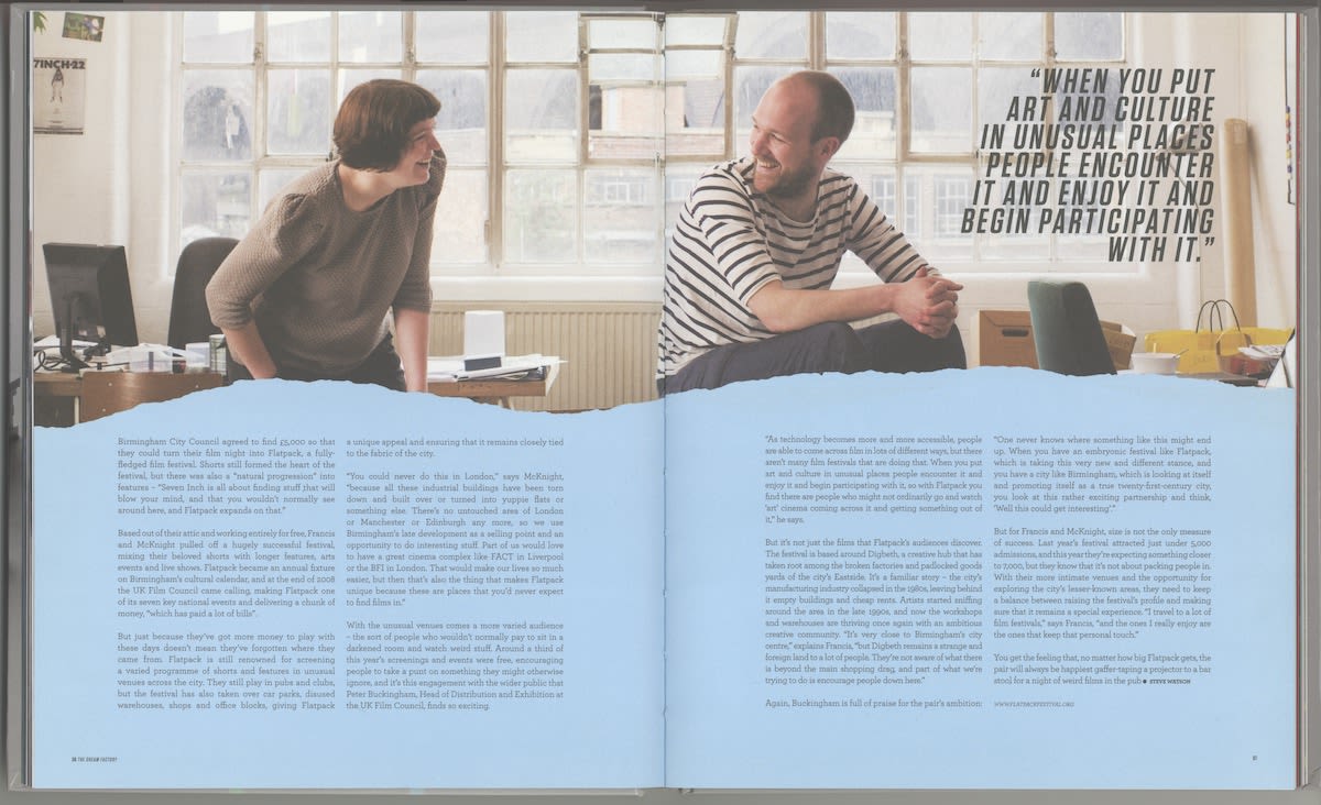 Flatpack had been going for two years by this point, organised from our attic in Balsall Heath. After receiving our first bit of regular funding, we took the leap to an office of our own at the Custard Factory. North facing, it was bloody freezing in the winter. Shortly afterwards myself and then co-director Pip McKnight took part in a smug hipster photo shoot which showed off our grubby windows in high definition.